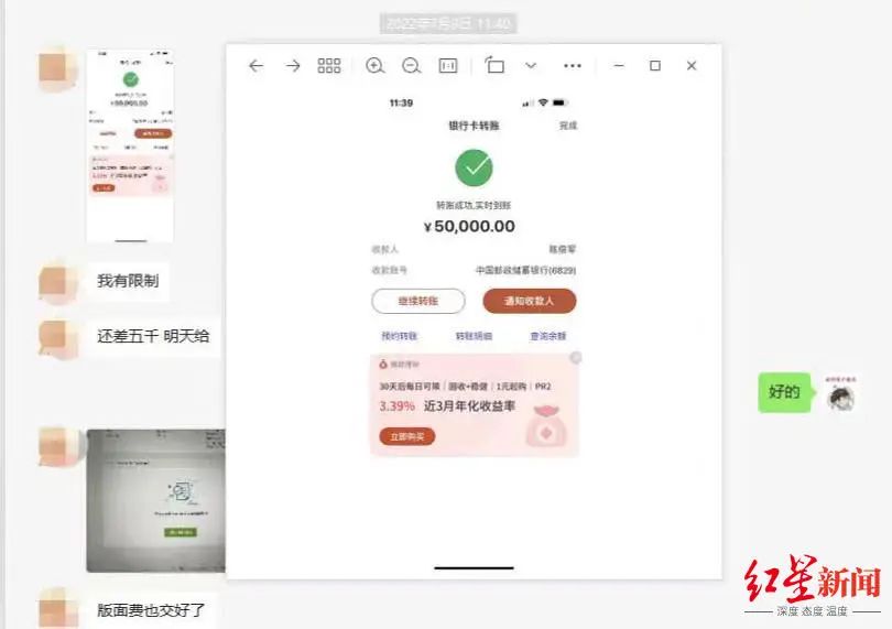 論文代寫機構展示給記者的成功案例,客户支付5萬尾款