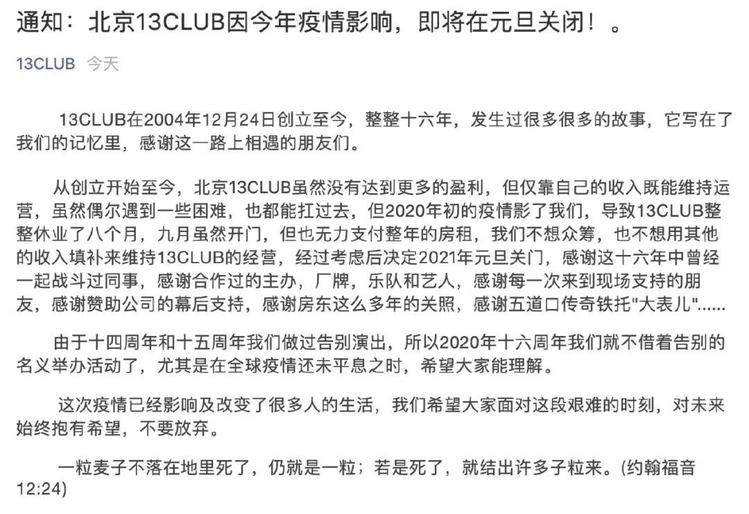 即便在去年消費反彈之後,Livehouse迎來了短暫的演出利好走向,但仍有不少Livehouse也如同星夢劇院一般,無法繼續堅守,被迫倒閉。僅在北京,自2020年以來,便有糖果、13Club、TEMPLE等多家Livehouse宣佈關閉,二環內也再無一家Livehouse存在。