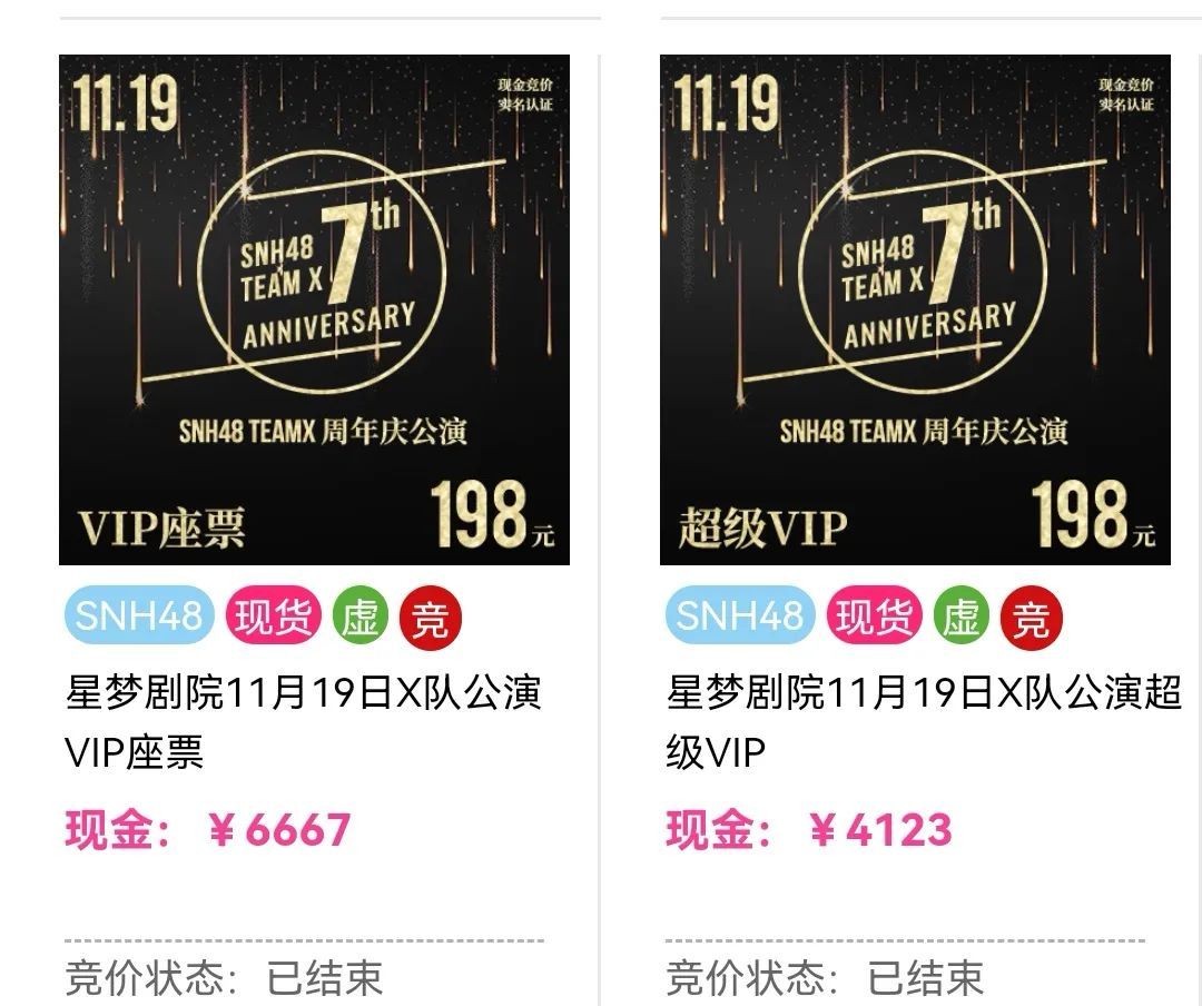 美踏控股(原絲芭文化)之所以在疫情下堅持線下演出模式,也是因為48系女團線下劇場的營收雖不如動輒過億的總選來得猛烈,但靠着門票及周邊的競價模式、握手會、一日店員、生日公演、節日公演等活動,創造出一筆不菲的穩定收入。像是SNH48 Team X於11月19日舉辦的週年慶公演,就曾出現198元的VIP座票被競價至6667元一張,198元的超級VIP門票也被以4123元拍下。