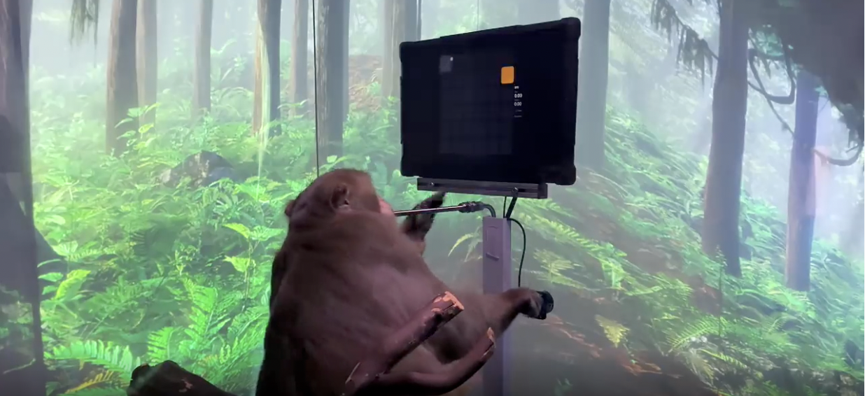 一隻植入其設備的猴子通過心靈感應玩電子遊戲。 圖片來源:Neuralink