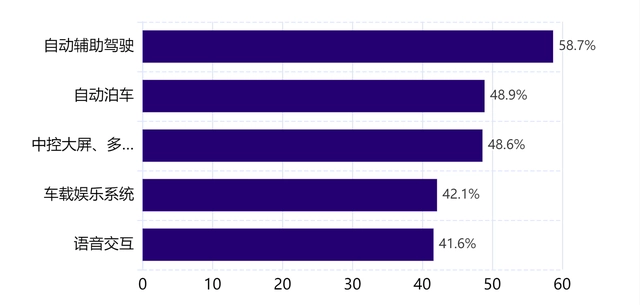 對於新能源汽車吸引Z世代羣體的科技功能或配置,自動輔助駕駛、自動泊車、中控大屏及多屏聯動這三項“黑科技”排在前三位,緊隨其後的是車載娛樂系統和語音交互功能。