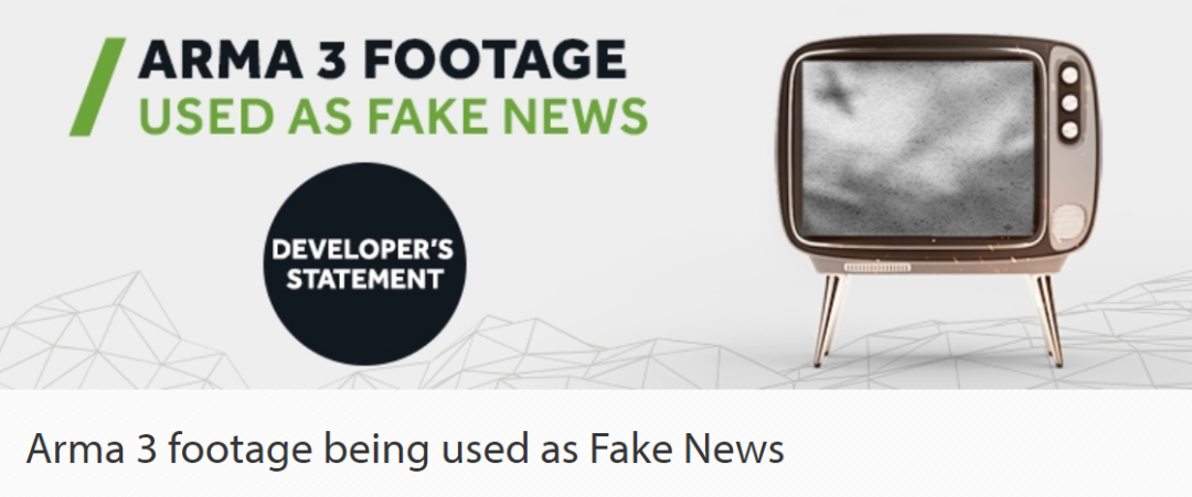 經典戰術遊戲《武裝突襲》系列的開發商波希米亞互動,於11月28日發佈了一則聲明:他們發現《武裝突襲3》的遊戲畫面,被頻繁用於偽造成現實中的戰爭錄像,以散佈一些虛假的新聞。為此,他們呼籲玩家警惕這些偽造行為。