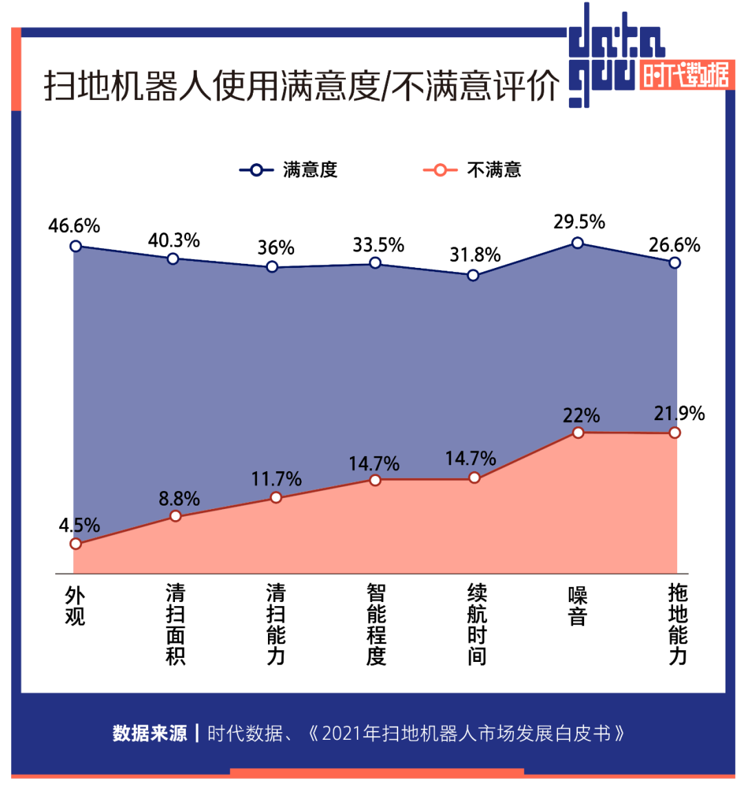 根據《2021年掃地機器人市場發展白皮書》數據,使用過掃地機器人的人羣在回答使用中遇到的問題時,清掃不乾淨排名第二,佔比達到44.9%,拖地效果不好佔比達到31%。