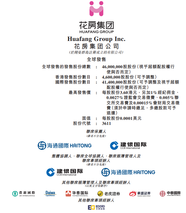 本次招股擬全球發售4600萬股股份,其中國際配售4140萬股,佔總發行數量90%,香港公開發售460萬股,佔總發行數量10%,預計發售價為2.80-3.60港元,每手1000股,入場費約3636港元。海通國際、建銀國際擔任聯席保薦人。