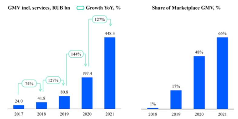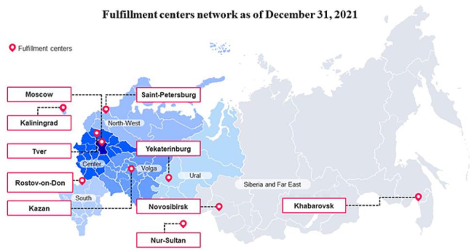 2018 年 9 月,OZON 推出了電商交易平台,並在此後其貢獻的 GMV 佔比增長至 65%。**從零售商轉身至電商平台,OZON 同樣繞不過亞馬遜的老路,比如需要投入高額成本自建物流系統。**其中就包括 2 萬多個自提點、由 OZON 履行的 FBO(fulfillment by OZON)履約服務以及為快速輸送生鮮、食品而搭建的 Dark 商店網絡等。根據財報顯示,OZON 的履行和物流網絡拓展,使其能夠每年處理 2.23 億個訂單。