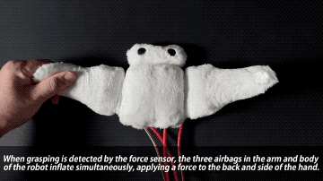 這樣一來,在佩戴者因為恐懼、疼痛等負面感受緊握雙拳時,小機器人就能通過給安全氣囊充氣,反握回去。