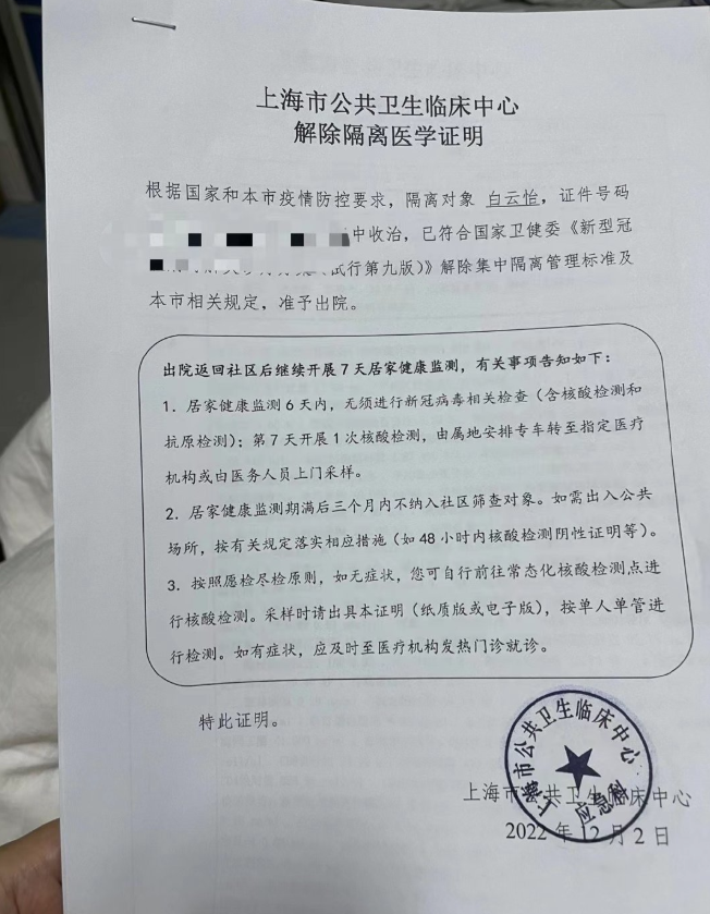 昨晚我已從金山公衞出院,被轉運到了一家隔離酒店,按照現在上海的規定,我還需要在這裏隔離7天,7天后,如果我的Ct值依然大於35,我就可以正式解封。不過我的健康碼不知為何還沒像其他出院病友一樣從紅碼變成黃碼,我正在通過APP申訴,大家祝我能成功且7天后順利返京吧。