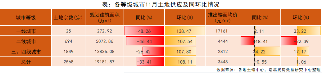 1、11月土地供應規模大幅上升,各等級城市供應全線走高