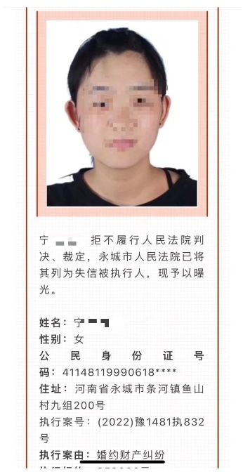 九派新聞注意到,11月7日,“永城法院”公眾號發佈一則文章顯示,寧女士因拒不履行法院判決、裁定,永城市人民法院已將其列為失信被執行人,並予以曝光。