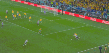 阿根廷右路逼搶線過高,被澳大利亞一路打穿,把球給進禁區;恩佐補位不及,澳大利亞追回一球。