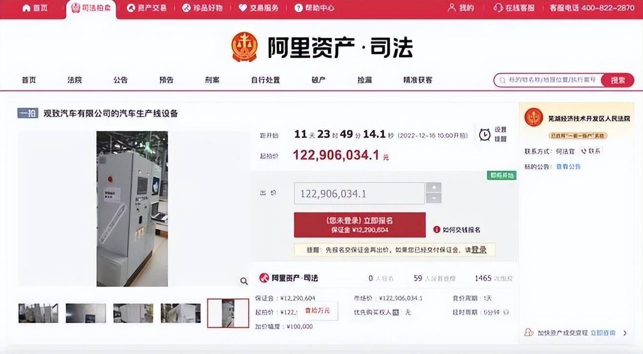 兜裏沒錢,外債一堆,甚至連觀致的汽車生產線設備也不得不被拿出來拍賣,據司法拍賣網信息顯示,起拍價約為1.23億元。連生產線都要拿來抵債,這一次恐怕誰都救不了觀致了。