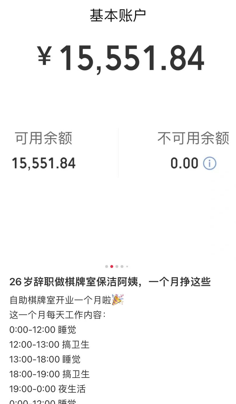 仔細翻主頁後才發現,原來這位月入5位數的“保潔阿姨”所打工的地點竟是自己創業開的無人棋牌室。果不其然,單靠給公司做保潔月入5位數還是一場夢。