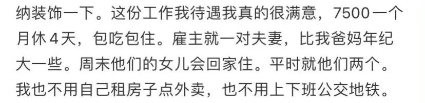 00後的這位網友,當初決定北漂的時候一定沒想到自己的第一份工作是當住家保姆。每天打掃衞生、做飯買菜,這些就算坐在家裏也需要完成的事情,居然還有人願意提供吃住還有可觀薪資。