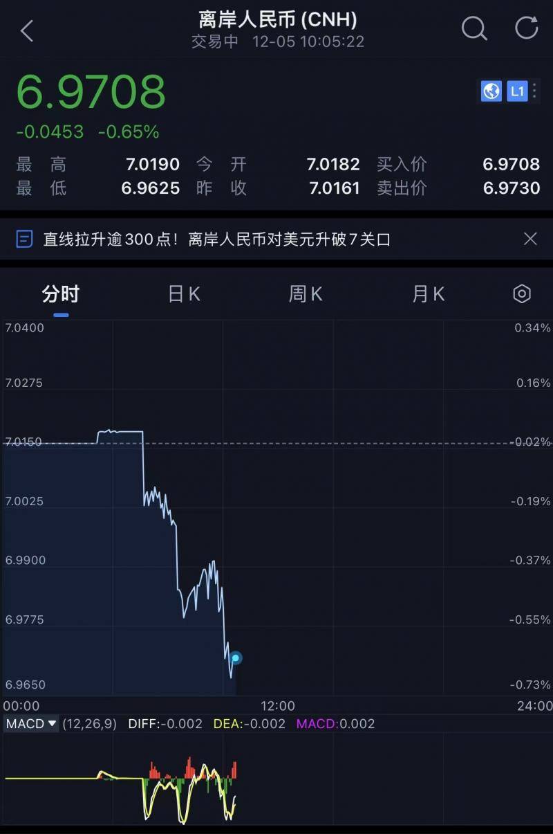 在岸、離岸人民幣兑美元匯率今日延續上週漲勢,雙雙收復7.0關口。截至12月5日上午9點45分,截至北京時間10點05分,在岸人民幣匯率報6.9794,漲幅756個基點,離岸人民幣匯率報6.9708,漲幅453個基點。這是人民幣兑美元匯率自9月份以來首次升破7.00。