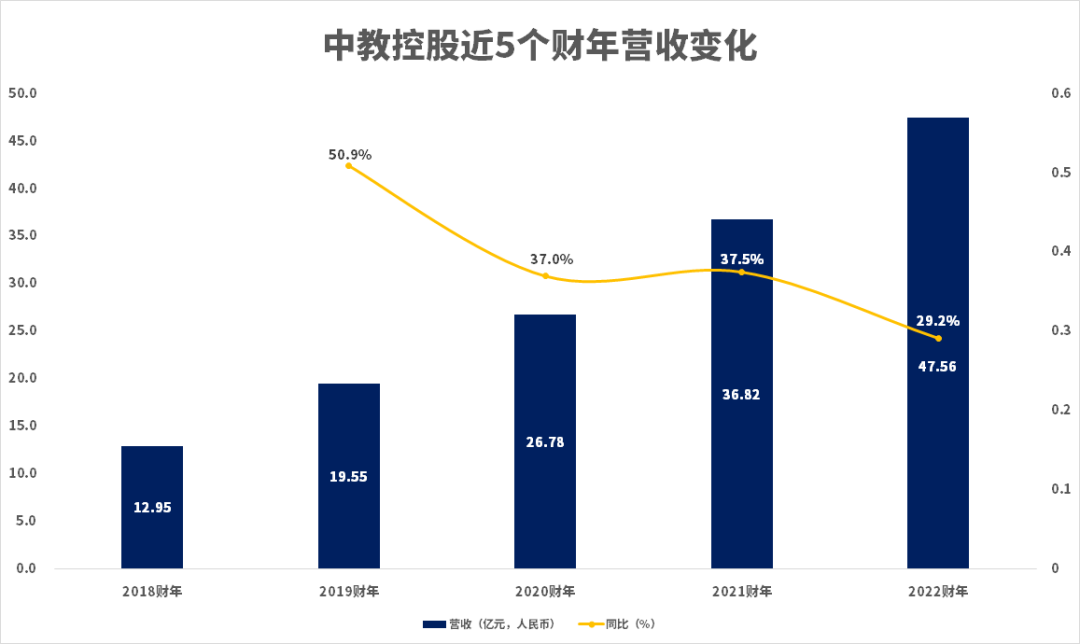 截至2022年8月31日年度,中教控股實現營收47.56億元,同比增長29.2%。在經濟下行壓力加大的情況下,依然保持兩位數增長,客觀説明民辦高校具備較強的抗風險能力。但不可否認的是,中教控股的增速略有放緩。疫情後的2020、2021年,中教控股的增速均超過37%。按照上市初披露的數據,中教控股2017年營收9.49億元,5年間年複合增長率達到38.04%,2022財年的增速已明顯低於平均水平。
