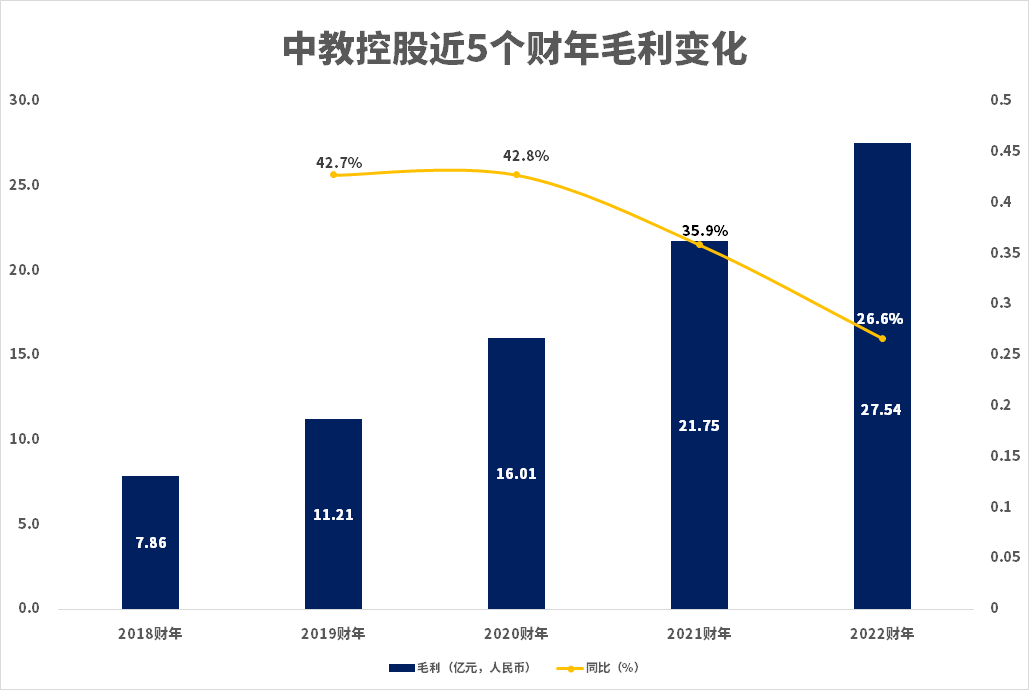 除了營收的變化,毛利的增速也在變緩。本財年,中教控股實現毛利27.54億元,同比增長26.6%。同樣是調整財報統計週期以來的最低增速。