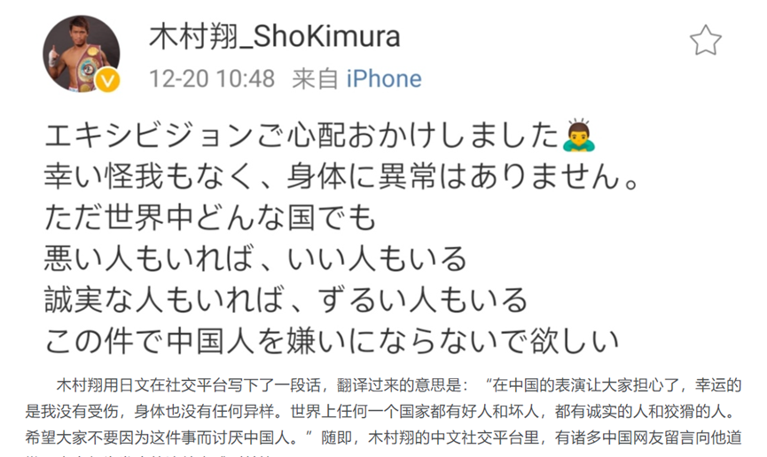 反觀木村翔,在受傷之後連忙在中文以及藍鳥上發佈了非常大度的通告,“武德”高下立判。
