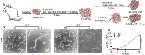 肝臟是哺乳動物的主要代謝器官。在體內平衡期間,肝細胞通常具有較低的週轉率。然而,肝臟在化學、病毒或機械損傷後表現出強大的再生,這歸因於肝細胞的立即增殖。小鼠進行2/3部分肝切除術(PHX)後,剩餘肝臟只需1周即可再生到原始大小。與體內強大的增殖能力相比,成體肝細胞已被證明極難培養和擴增而不會在體外失去其肝臟特性。由於原代肝細胞在藥物毒性和代謝評價中的廣泛應用,以及肝細胞療法在肝病中的潛在應用,確定體外擴增肝細胞的方法是一項緊迫的任務。據報道,肝損傷後的肝細胞補充是通過肝細胞和導管樣祖細胞之間的可逆過渡發生的。2017年,兩項研究根據這一祖細胞思想開闢了肝細胞培養的新維度。有人報道,小分子A-83-01(TGF-β信號傳導抑制劑)、Y27632(ROCK激酶抑制劑)和CHIR99021(典型Wnt通路激活劑)的混合物可以將大鼠和小鼠肝細胞轉化為具有高增殖能力的肝祖細胞(HPC)。另一項研究表明,五種分子A-83-01,Y27632,CHIR99021,S1P(鞘氨醇-1-磷酸)和LPA(溶血磷脂酸)的組合可以通過促進肝細胞和HPC之間的可逆過渡在體外擴增小鼠肝細胞。有趣的是,一項研究報告了TNFα(肝臟再生中重要的炎性細胞因子)的組合、A-83-01、Y27632和CHIR99021可促進3D培養中小鼠肝細胞增殖。之後,已經報道了一種通過在低氧條件下使用Wnt3a蛋白與A-83-01和Y27632來實現人肝細胞大規模擴增的方案。最近,更多的研究報告了在2D或3D條件下使用化學物質與生長因子或條件培養基結合使用的人胎兒或成人肝細胞的培養。這些條件都涉及使用體內不存在的化學品,並且僅見於具有完全分化能力的單個肝/肝細胞祖細胞的克隆擴增。有沒有一種更生理和更簡單的方法可以支持肝細胞的克隆擴增?在部分肝切除術模型中,許多信號分子,包括EGF,HGF,IL6,TNFα,胰島素,膽汁酸,瘦素等,在手術後血液中迅速增加。IL6是一種在炎症中廣泛研究的細胞因子,IL6在肝臟再生中也起着核心作用。肝部分切除術後,庫普弗細胞和肝細胞迅速產生IL6。在IL6基因敲除小鼠中,肝部分切除術後肝臟再生延遲伴有肝壞死增加,可以通過IL6治療進行糾正。IL6敲除增加CCl後肝細胞凋亡治療,而IL6預處理可減少肝損傷並加速再生。在IL6受體缺陷小鼠中也觀察到了類似的現象。儘管許多證據支持IL6促進體內肝臟再生,但它是否可用於支持體外肝細胞的長期擴張仍不清楚。在這裏,研究報道IL6可以促進長期擴增(~150天內>30代,理論擴增~1035倍)的體外小鼠原代肝細胞,通過將肝細胞轉化為誘導肝祖細胞(iHPCs),其維持分化為肝細胞的能力。IL6還支持建立單個肝細胞衍生的iHPC克隆。從這些iHPC分化的肝細胞可以很容易地移植和重新填充Fah−/− 的整個肝臟小 鼠。進一步的研究表明,IL6主要促進二倍體肝細胞的增殖。許多轉錄因子,包括Barx2,FoxM1,Elf3和Mxd3,在IL6誘導的肝細胞增殖中起關鍵作用。