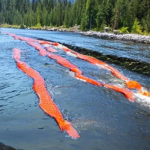 即便是輸入“三文魚逆流而上”的描述,AI畫的還是一長條三文魚片在水裏游泳。