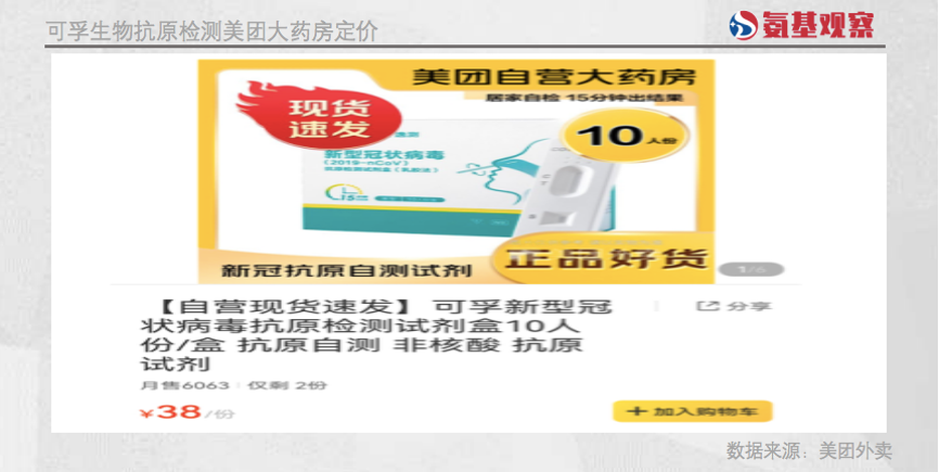 過度內卷的市場難以產生高溢價,抗原檢測市場也是如此。如下圖所示,可孚生物的抗原檢測10人份產品,美團大藥房最新定價為38元,即單價僅有3.8元/個。