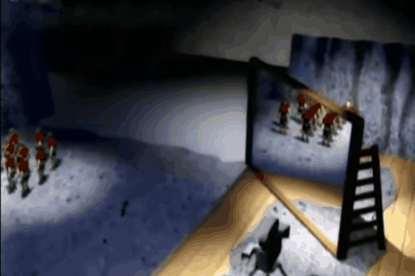 這種效果比《 卓別林 》裏的遮罩強的地方在於,因為鏡子反射的是真實的場景,所以會有物體景深,顯得更加真實。