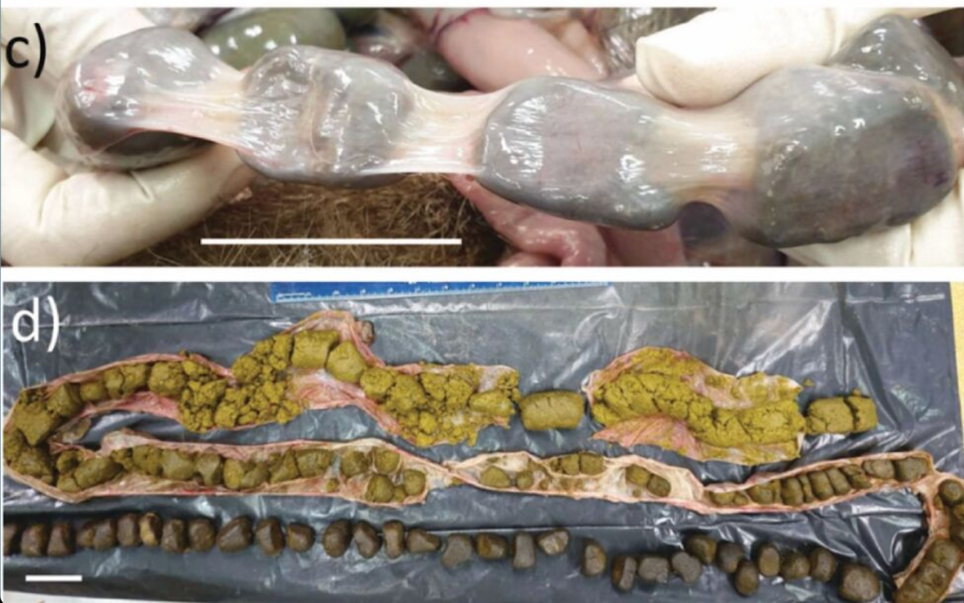 解剖3米長的袋熊腸道顯示,便便從胃附近的黃色漿液逐漸轉變為肛門附近的乾燥棕色立方體|參考資料[5]