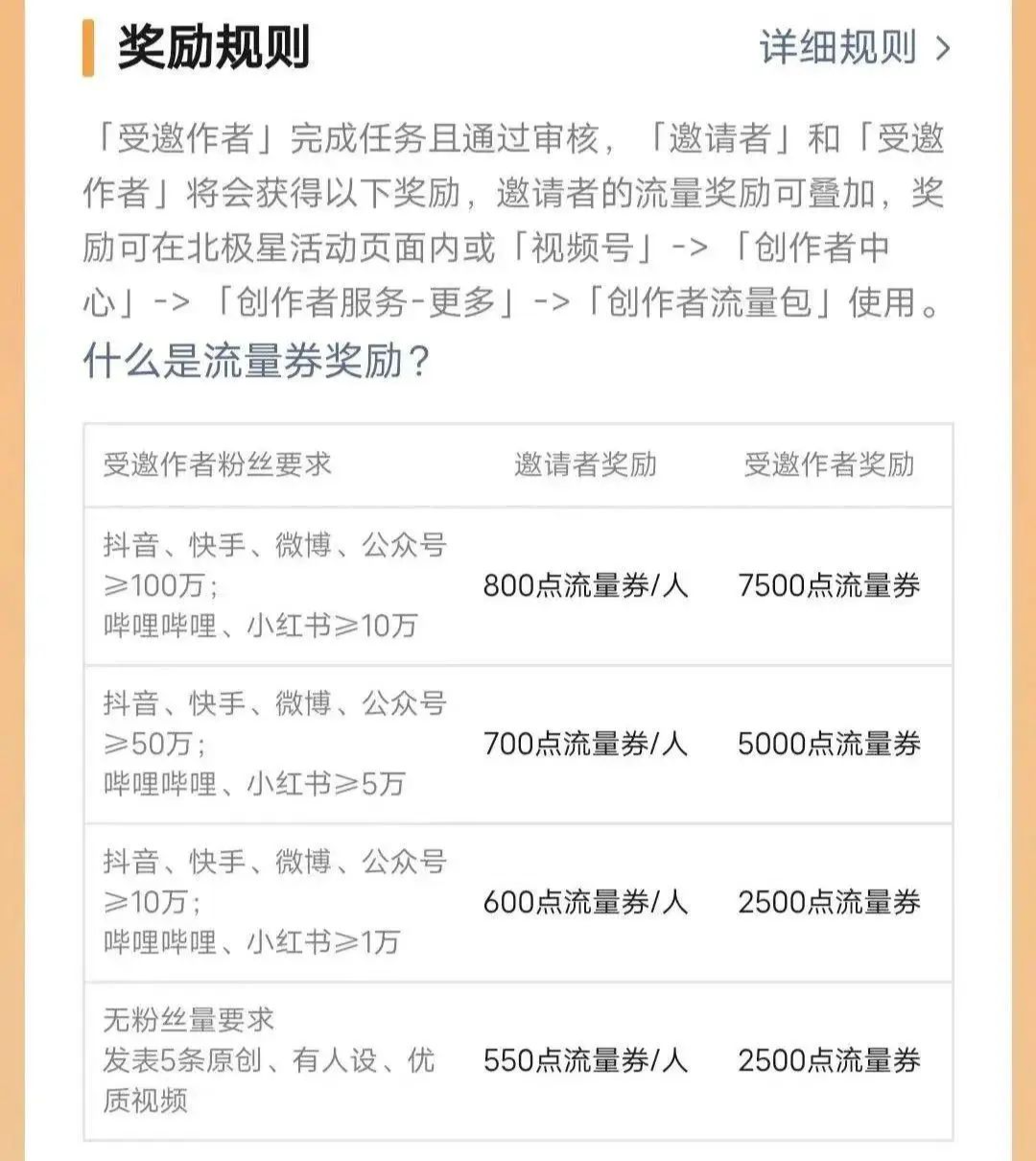 與此同時,視頻號也在積極招募各平台博主入駐,並給予流量券激勵。