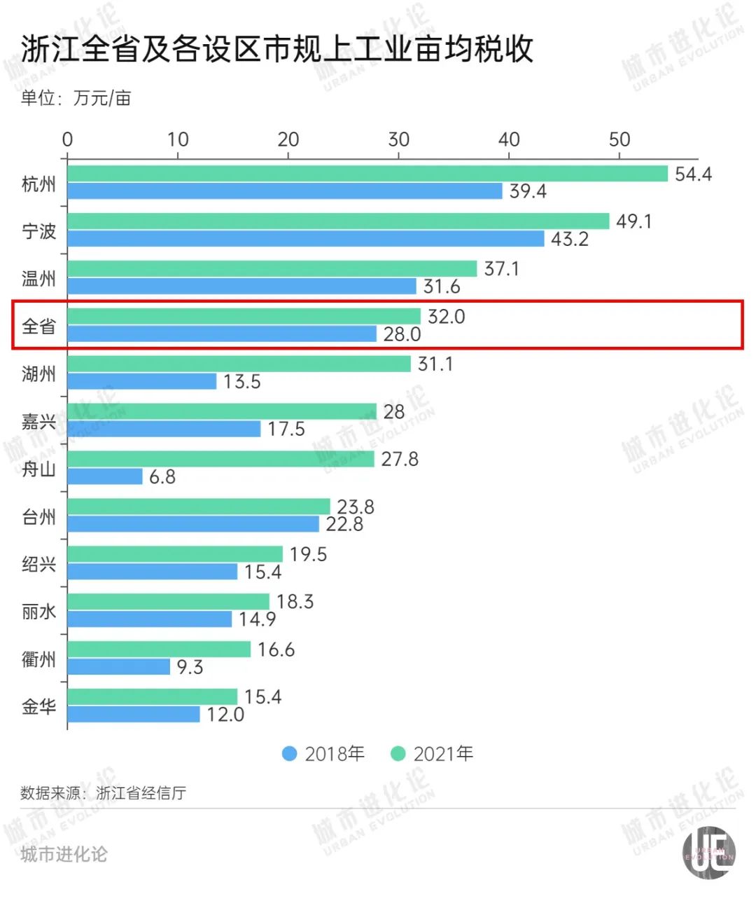 浙江省經信廳公佈的“畝均數據”顯示,從2018年到2021年,浙江全省規上工業畝均税收從28萬元/畝提升到32萬元/畝;杭州規上工業畝均税收從39.4萬元/畝提升至54.4萬元/畝,排名從第二變為第一,超過寧波;寧波規上工業畝均税收從43.2萬元/畝提升至49.1萬元/畝。