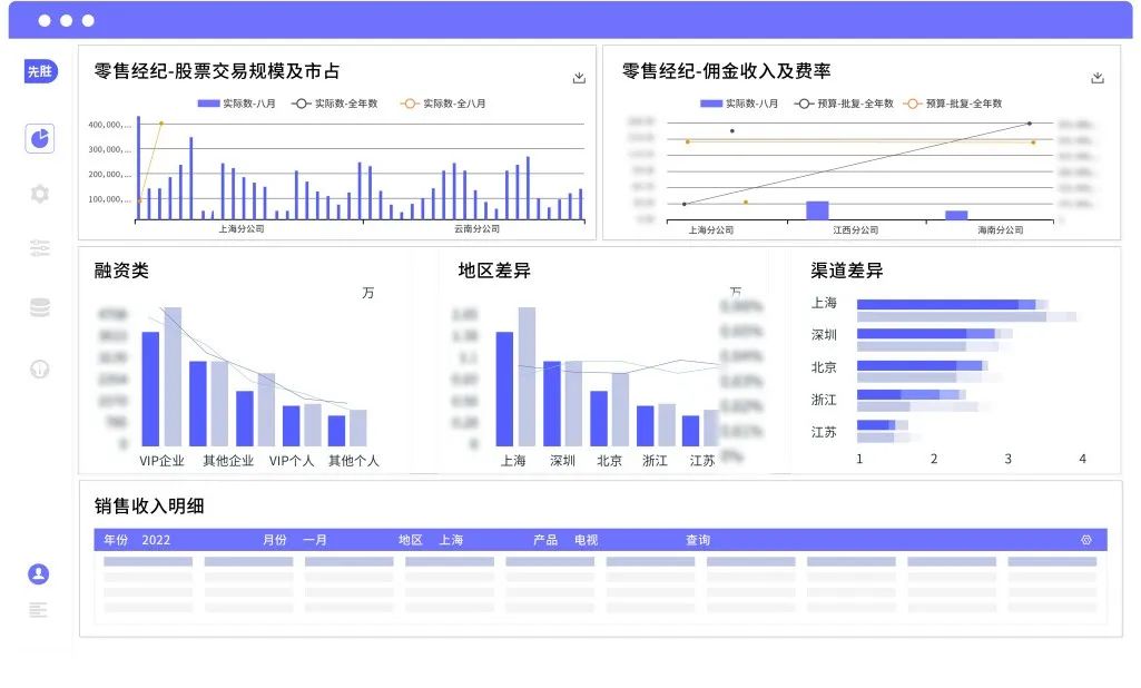 先勝為“H證券”構建了管理駕駛艙和主題分析,按不同層級、不同部門分場景構建不同的分析內容,形成多維度、穿透式分析,並實現按區域、營業部等的差異分析與比較,尋找業務發生的原因;支持面向業務部門,按預算指標、考核信息進行整體的展現;支持用户快速自定義分析模型,提供對應的決策支持。