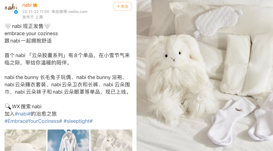 nabi官方小程序顯示,在第一批上線的單品裏,純白睡衣套裝和浴袍售價都是988元,兔子玩偶388元,最便宜的是兩雙168的純白色襪子和148的純白色眼罩。目前除了988的兩款外,其他產品都已經顯示售罄,暫時還沒有新產品上線。