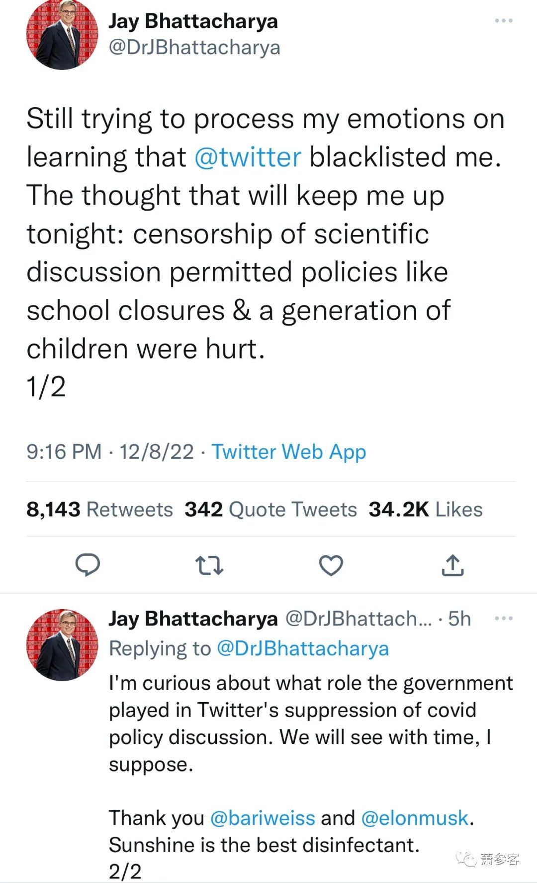 **傑伊·巴塔查里亞博士的回應推文:**我仍在努力處理我在得知推特將我列入黑名單後的情緒。這個想法讓我今晚無法入睡:對科學討論的審查允許學校關閉等(新冠大流行)政策,讓一代兒童受到了傷害。