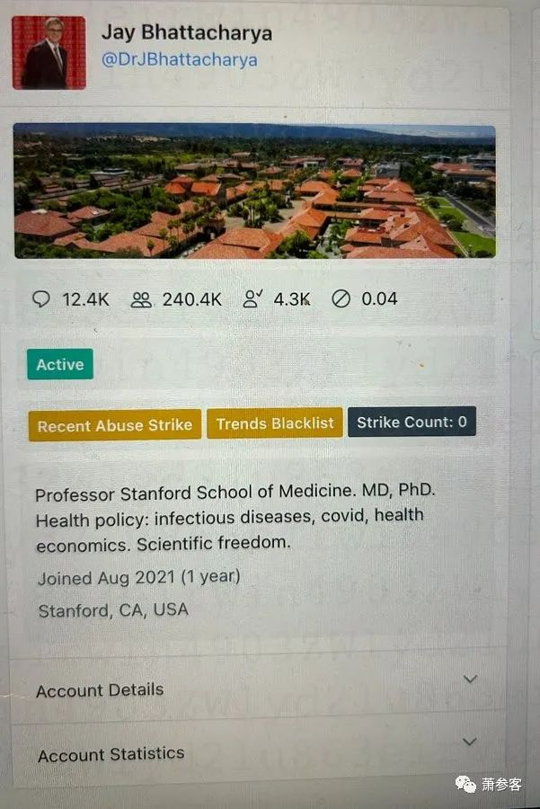 3. 以斯坦福(Stanford)的傑伊·巴塔查里亞(Jay Bhattacharya)博士為例(@DrJBhattacharya),他認為新冠封鎖會傷害兒童。推特秘密地將他列入 “趨勢黑名單”,阻止他的推文成為熱門。