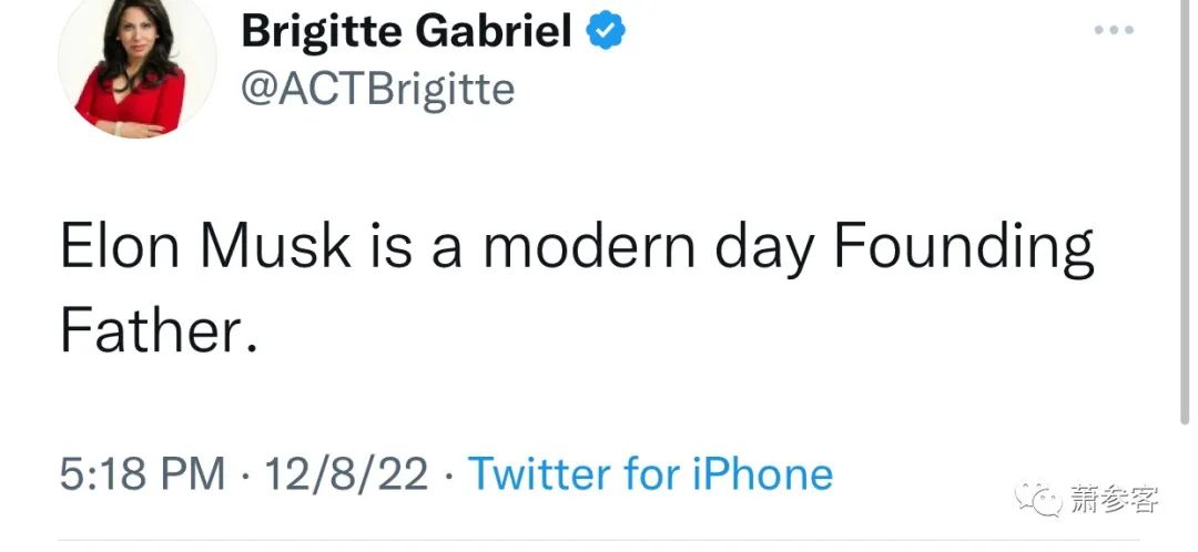 他真的是做了一件很多美國人想都不敢想、更是不敢為的事,大膽披露真相!尤其是在美國當前這麼黑暗的時刻,三權都掌握在民主黨與深層政府(Deep State - DS)的手裏,他自己掏腰包,收購推特、清理推特、改造推特、曝光推特…… 一系列的動作與作為僅僅一個多月的功夫 (10月27日晚上正式接手推特),幹了美國FBI與司法部從未有過的效率與大事!真的就像一束光穿過美國至暗的時光,對他應該讚揚有加!就像保守派的媒體大V - 加百利(Brigitt Gabriel)下面説的這句話,一點也不過分!