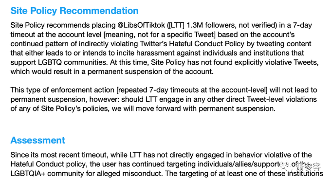 19. 但在她第7次被停號後,該委員會在2022年10月的一份 SIP-PES 內部備忘錄中承認:“(“抖音自由派”)LTT 沒有直接從事違反仇恨行為政策的行為。” 請看這裏: