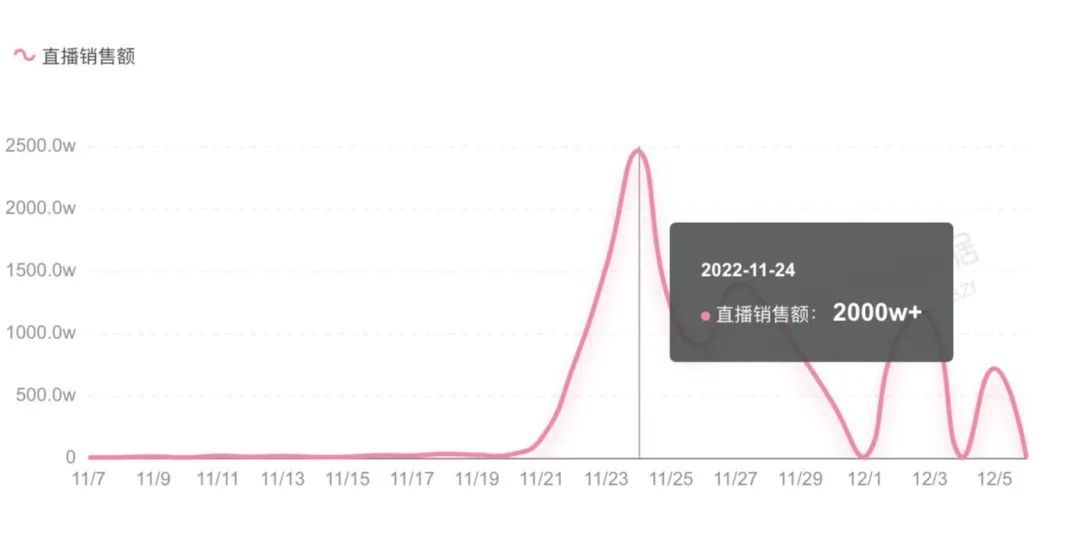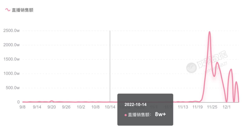 當下麻六記線上零售的爆發式增長大概率很難持續。灰豚數據顯示,麻六記直播間銷售額在11月22日達到了500萬元的峯值後就經歷了斷崖下跌態勢,目前水平為100萬元左右。而張蘭直播間的銷售額也從2000w元跌到了400-1000萬元不等。