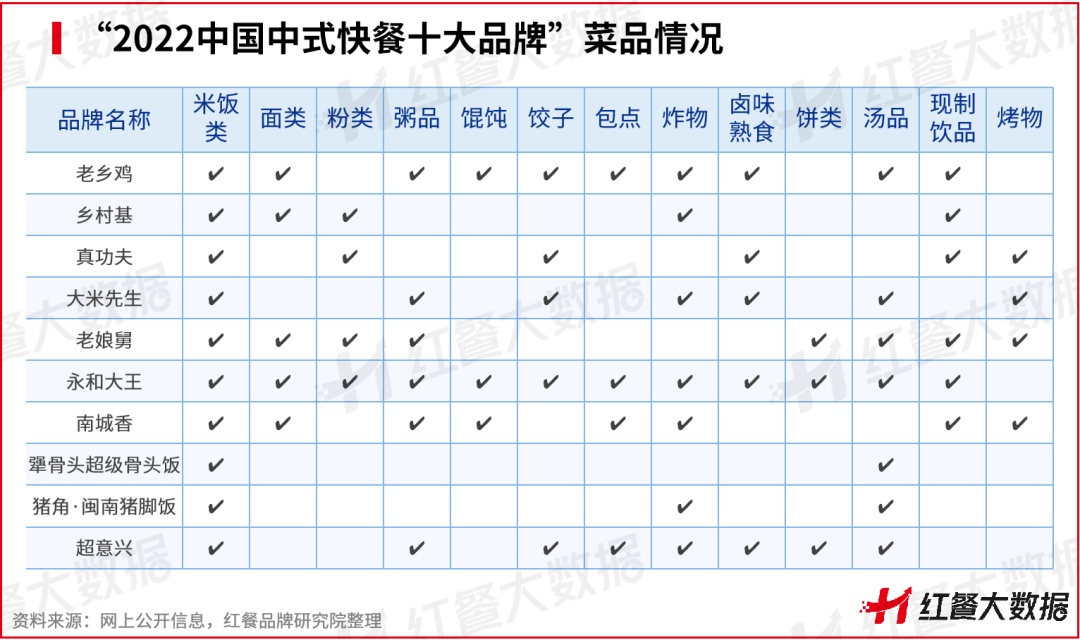 除了不斷豐富菜式之外,橫向擴充產品種類和多時段運營也是很多品牌的通用做法。紅餐品牌研究院統計發現,在“2022中國中式快餐十大品牌”的菜單中,除了面類、粉類、粥品等主食類產品以外,炸物、滷味熟食、餅類、烤物等休閒小吃也是品牌跨品類拓展產品線的熱門選項。其中,永和大王、老鄉雞、超意興的菜品品類覆蓋度尤為廣泛。