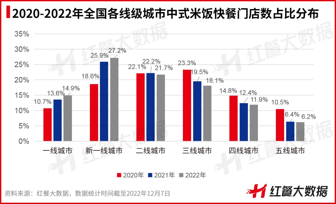中式米飯快餐剛需性強,擁有較高的消費認知度和廣泛的受眾人羣,門店在全國各地均有分佈。據紅餐大數據,截至2022年12月7日,中式米飯快餐的門店數在一線城市的佔比為14.9%,新一線城市、二線城市的門店數佔比分別為27.2%和21.7%,三線及以下城市的門店數佔比為36.2%。