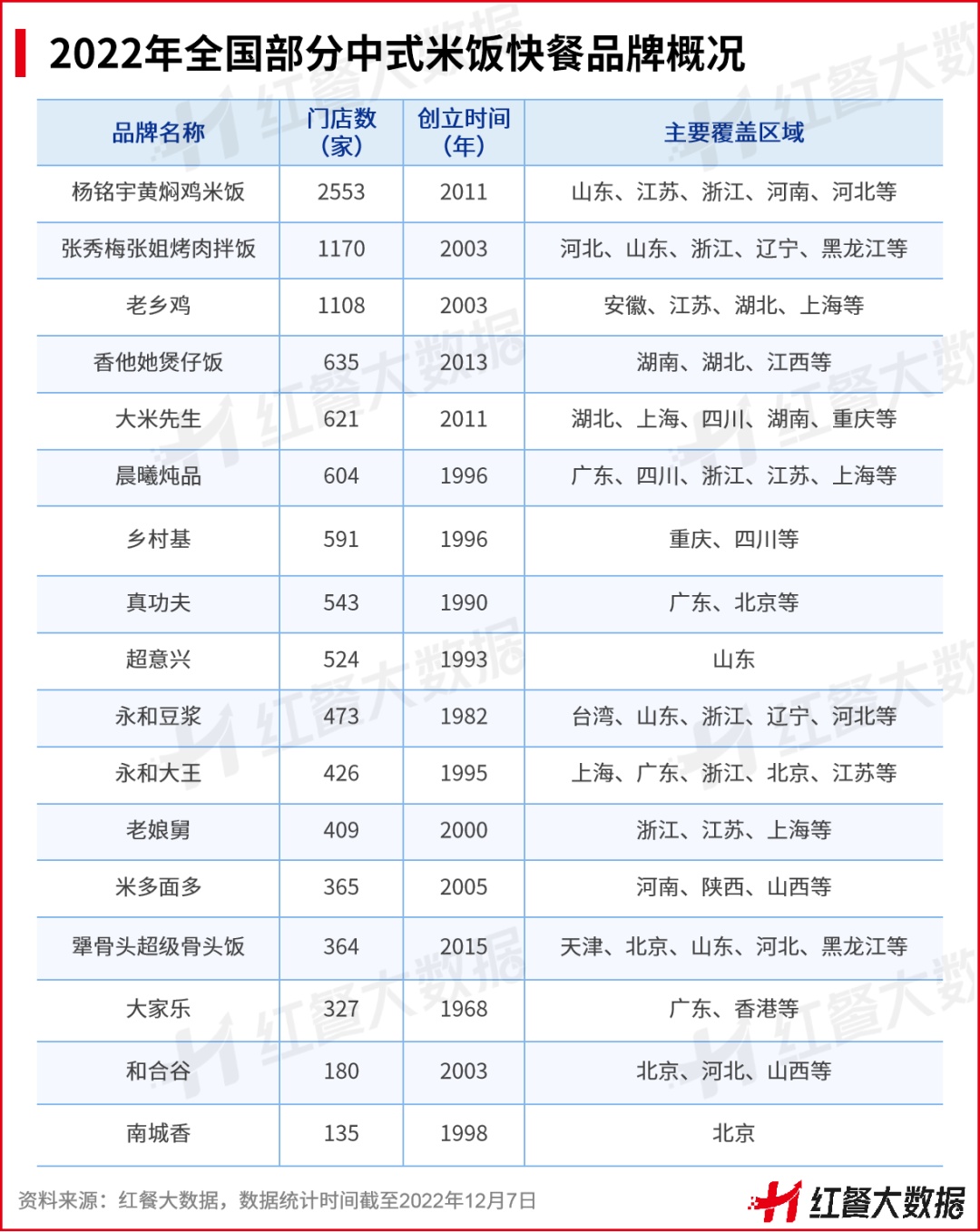 但是也有部分中式米飯快餐品牌實現了逆勢擴張,比如大米先生、老鄉雞等。近年來,大米先生快速發展,截至2022年12月7日,其門店數已經達到了621家;老鄉雞亦加快了拓店步伐,先後入駐了深圳、北京等城市,目前其門店數為1100餘家。