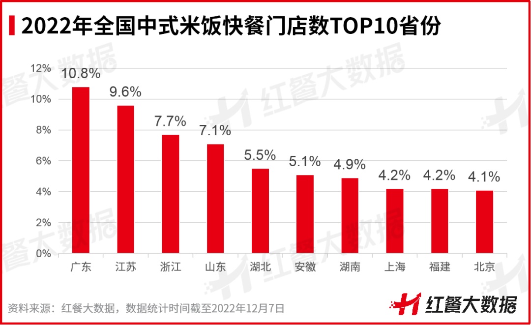 從省份分佈來看,截至2022年12月7日,分佈在廣東、江蘇這兩大省份的中式米飯快餐門店最多,佔比分別為10.8%、9.6%,其次是浙江省和山東省,門店數佔比分別是7.7%、7.1%。