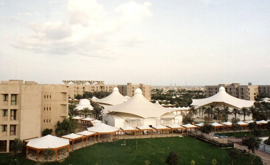 設計師便以貝都因人帳篷為靈感設計和建造了一組臨時結構,其中包含一個可容納500人的禮堂、一個可容納250人的會議室和三個大型接待室。雖然“帳篷”聽起來簡易,但裏面各項設施配備齊全,配有空調、中央供暖系統、冷熱水、消防噴頭和應急發電機。帳篷的設計還巧妙地將主宮殿建築羣與蜿蜒的棕櫚園和噴泉庭院連接起來。