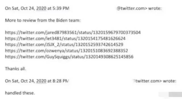 當年推特管理層的郵箱中與“拜登團隊”往來的郵件被挖了出來,“拜登團隊”要求在推特刪除亨特·拜登的相關信息,推特高管隨後回覆是“搞定了”。而且推特確實採取過“非常措施”限流有關亨特·拜登的醜聞報道,還刪除了相關鏈接。
