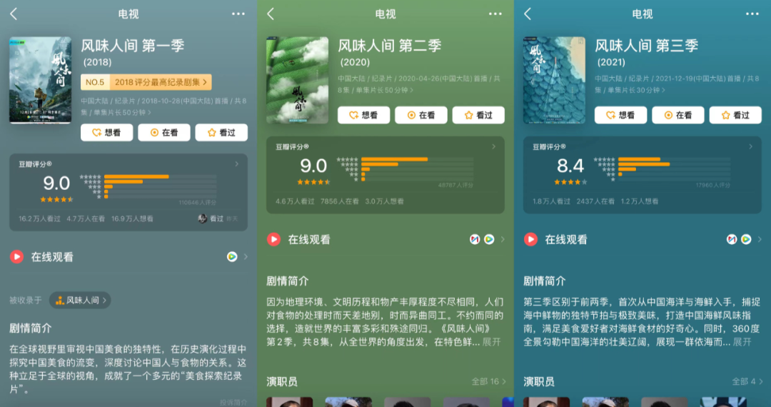 《風味人間》的四季作品,豆瓣評分都維持在9.0左右的高位,但已完結的前三季的評分人數,分別為11萬、4.8萬和1.79萬。