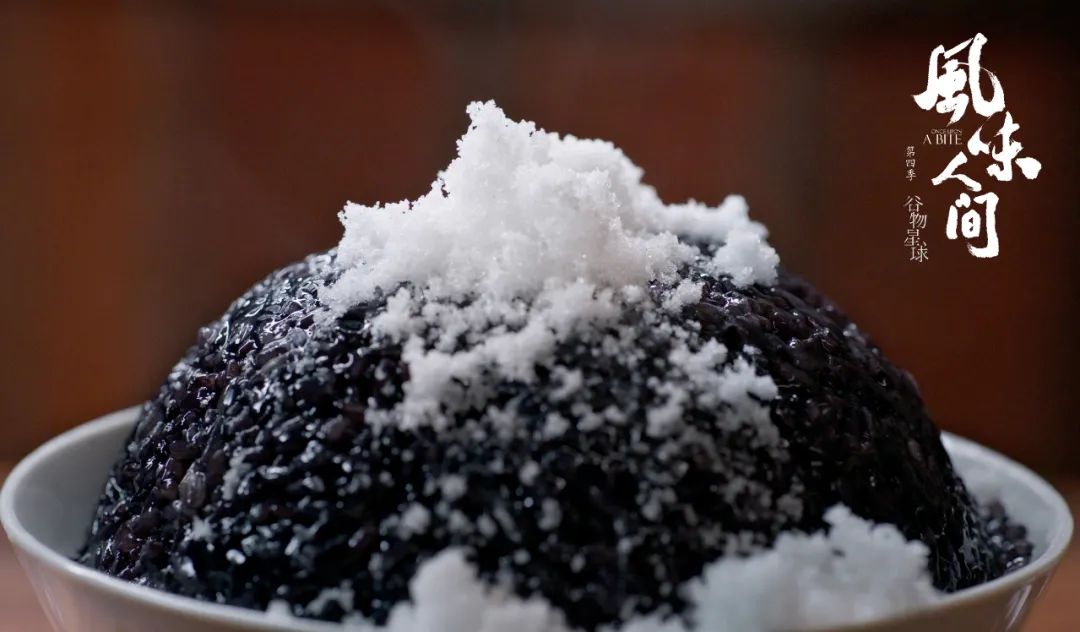 砂糖鋪撒在黑青色的米飯上,米飯蒸騰的熱氣讓糖粒化成液體,沁入飯粒間隙。這是《風味人間4·穀物星球》(以下簡稱《風味4》)記錄的“烏米飯”製作流程的最後一步,在花青素的作用下,糯米變成黑色,再加上一層甜蜜,被端上人們的節日餐桌。