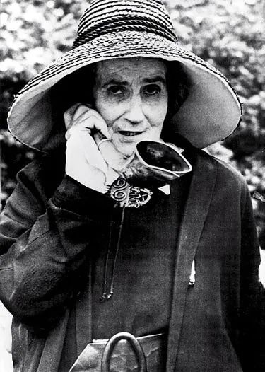 早期的助聽器用起來和打電話一樣,下圖中是一位名叫德梅隆的女士在使用助聽器。