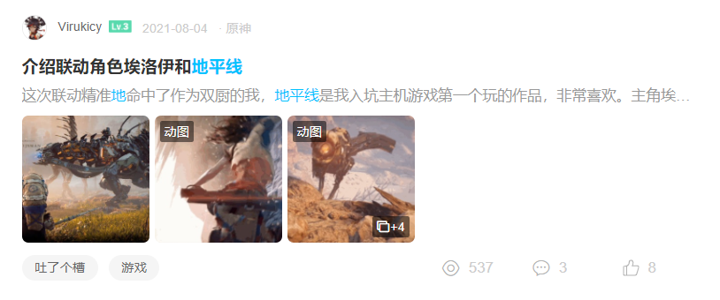 無論是何種聯動,“出圈”自然也為遊戲帶來了不同類型的新玩家。即便原神以“二次元”屬性著稱,但在官方宣佈將與飛碟桌合作推出新動畫後,玩家社區裏依然出現了很多向其他人科普“飛碟桌是什麼?”的帖子,類似的情況也發生在《原神》與主機遊戲《地平線》聯動的時候。