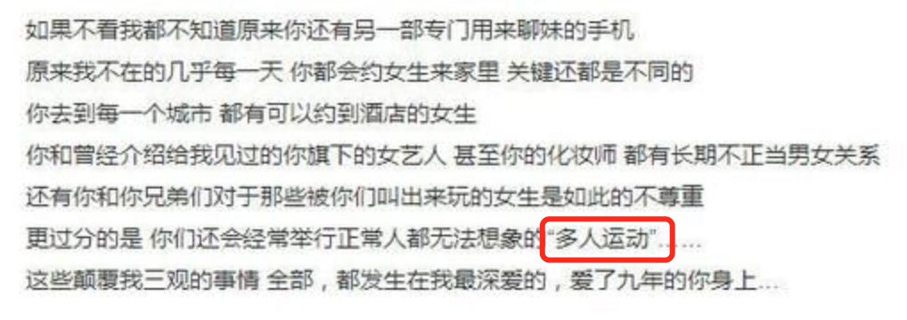 此外還把自己描繪成被綁架的無辜男孩,稱結婚時被李靚蕾用懷孕要挾,離婚時又被勒索錢財。