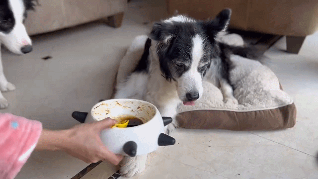 雖然妞妞已經看不見了,但是有東西送到嘴邊,它都來者不拒,吃得很香。