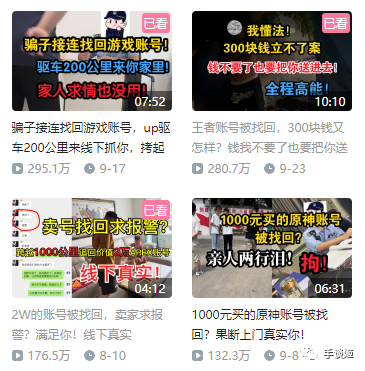 今年六月,某海鮮遊戲賬號交易平台發佈一個視頻,講他們橫跨2500公里,去尋找賬號惡意找回者的視頻,這個視頻目前已經有300多萬播放量了,而他們從後來發表的的賬號找回系列也常常播放超過百萬。