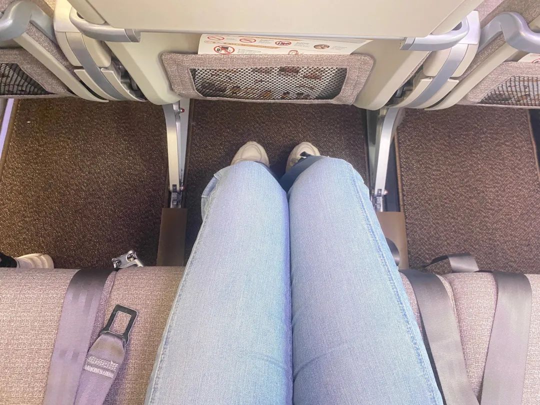 出行一客(ID:carcaijing)實測發現,中間位置的座椅坐上去明顯比同類型飛機要寬敞一些,兩腿旁邊還有很多餘量。