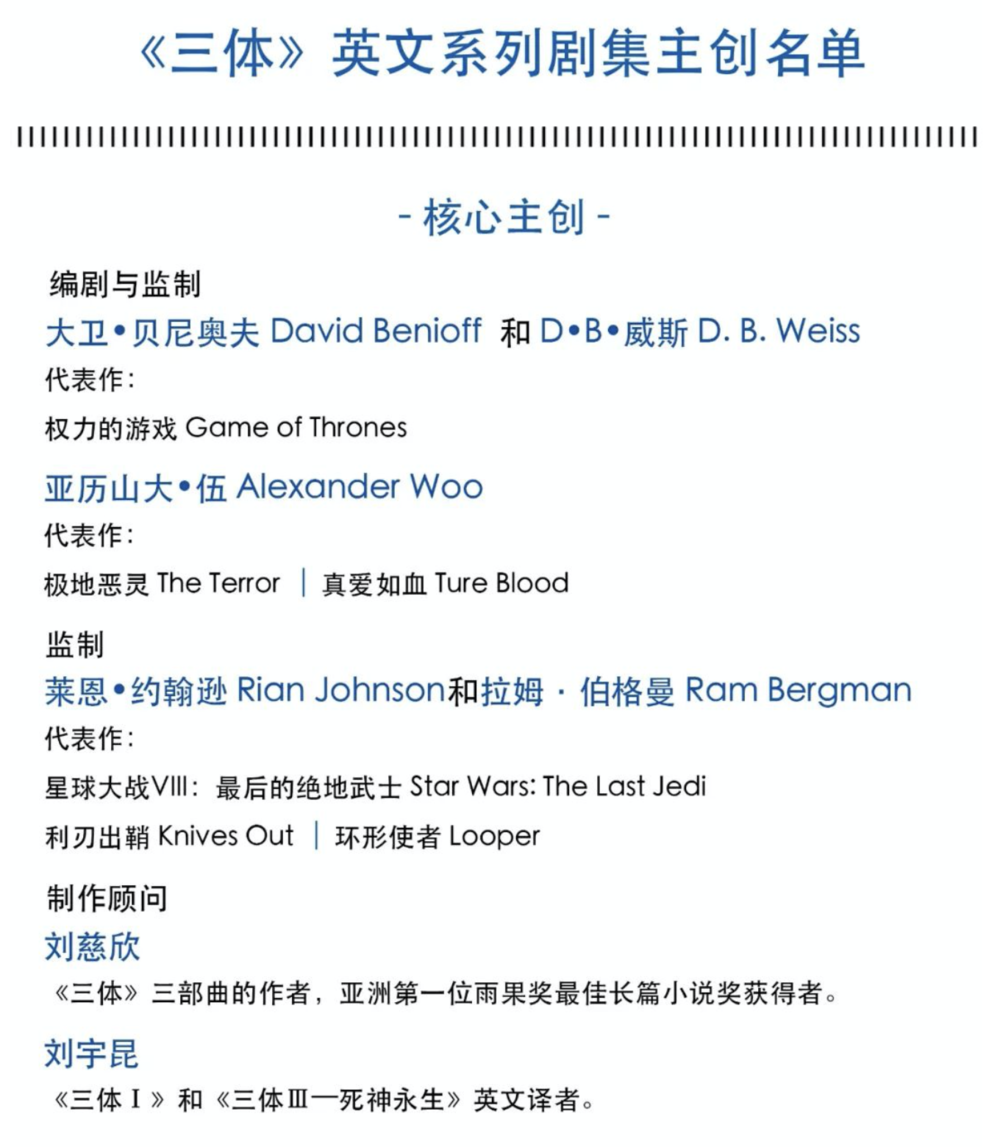 在官宣名單中,觀眾能想象到的最豪華劇集配置,都在《三體》裏了。甚至,為了“確保對原著精神進⾏忠實、準確地表達”,奈飛版《三體》將劉慈欣、英文版翻譯劉宇昆,以製作顧問的身份,拉進核心主創名單。